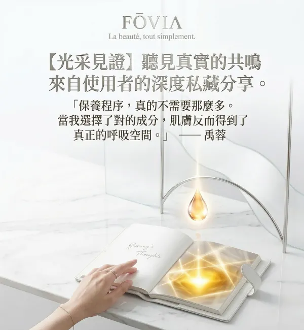 當極簡主義遇上 FŌVIΛ,美麗不再是繁瑣的堆疊。本期『光采見證』分享使用者 禹蓉 (Yurong) 的深度體驗:看她如何從高壓生活與複雜程序中解脫,透過琥珀瓶的兩步驟儀式,找回肌膚與心靈的純粹共鳴。聽見最真實的聲音,重新定義屬於妳的減法保養。